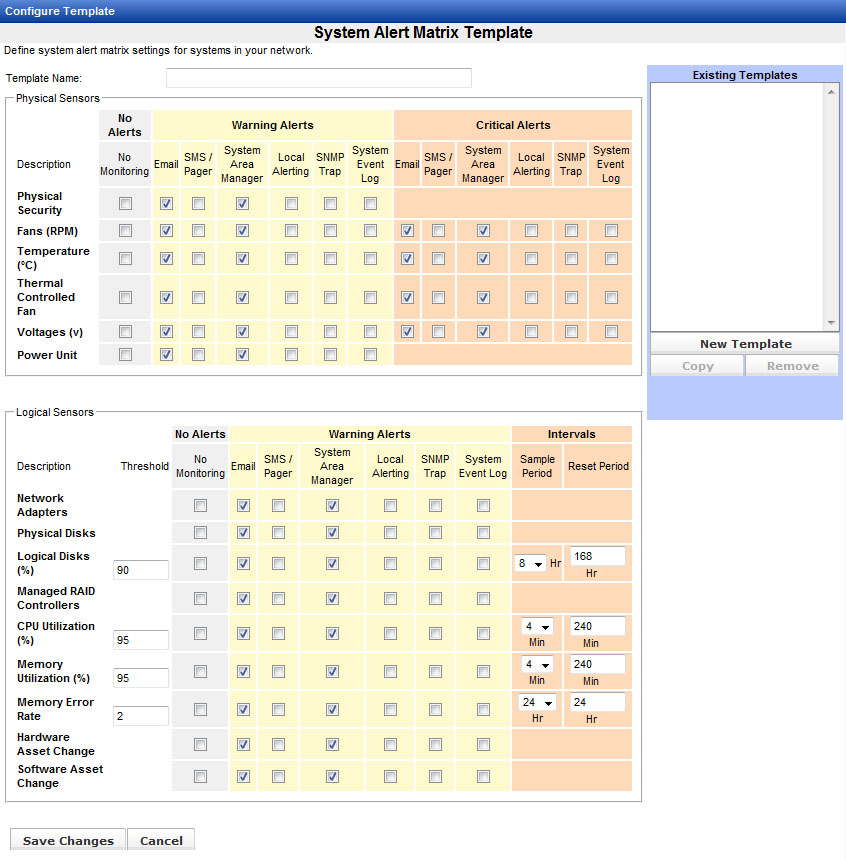 The System Alert Matrix defines how systems will be monitored and what types of notification alerts will be sent. Choose which alerts will be generated (email, SMS text, etc.) for each physical or logical sensor, or choose the No Monitoring option if no alerts are needed. For CPU and memory, the reporting thresholds, sample periods, and reset periods can be configured. Different templates can be set up to be applied according to the type of system (workstation, notebook, server) or for any other defined groups. When you have made your selections, scroll down and click the Save Changes button.