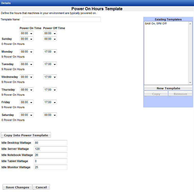 The Power On Hours Template specifies the hours that a group of machines should be powered on. Use the default template or create your own. The easiest way may be to copy the default template and then make any desired changes.