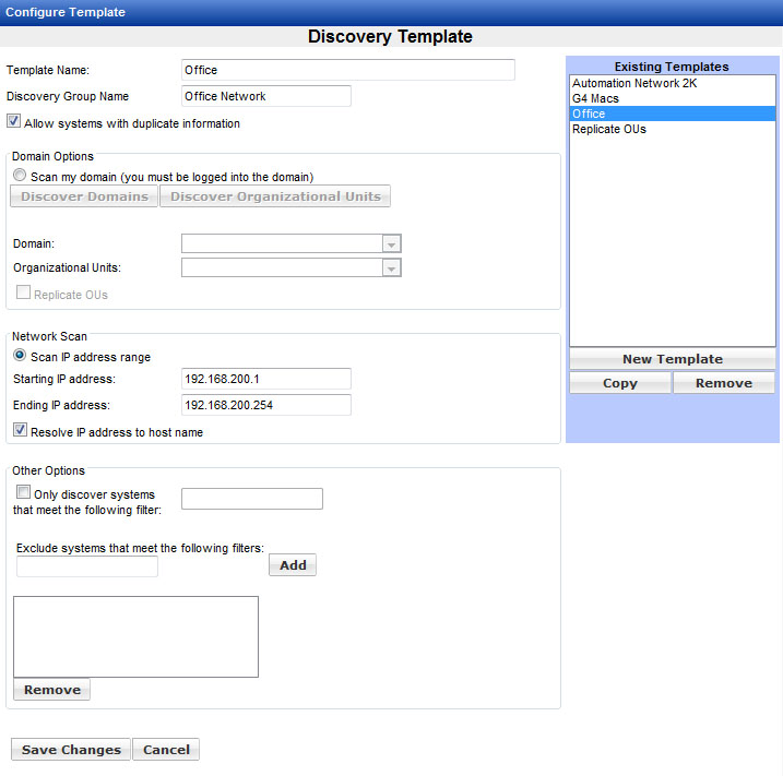 Machines on the network can be discovered based on IP address ranges or Active Directory domains and Organizational Units.