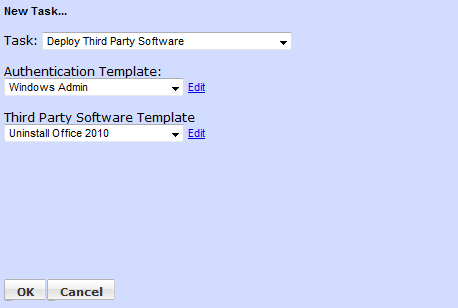 In the New Task dialog, choose the Windows authentication template and the newly created Office 2010 uninstallation template. Click OK.