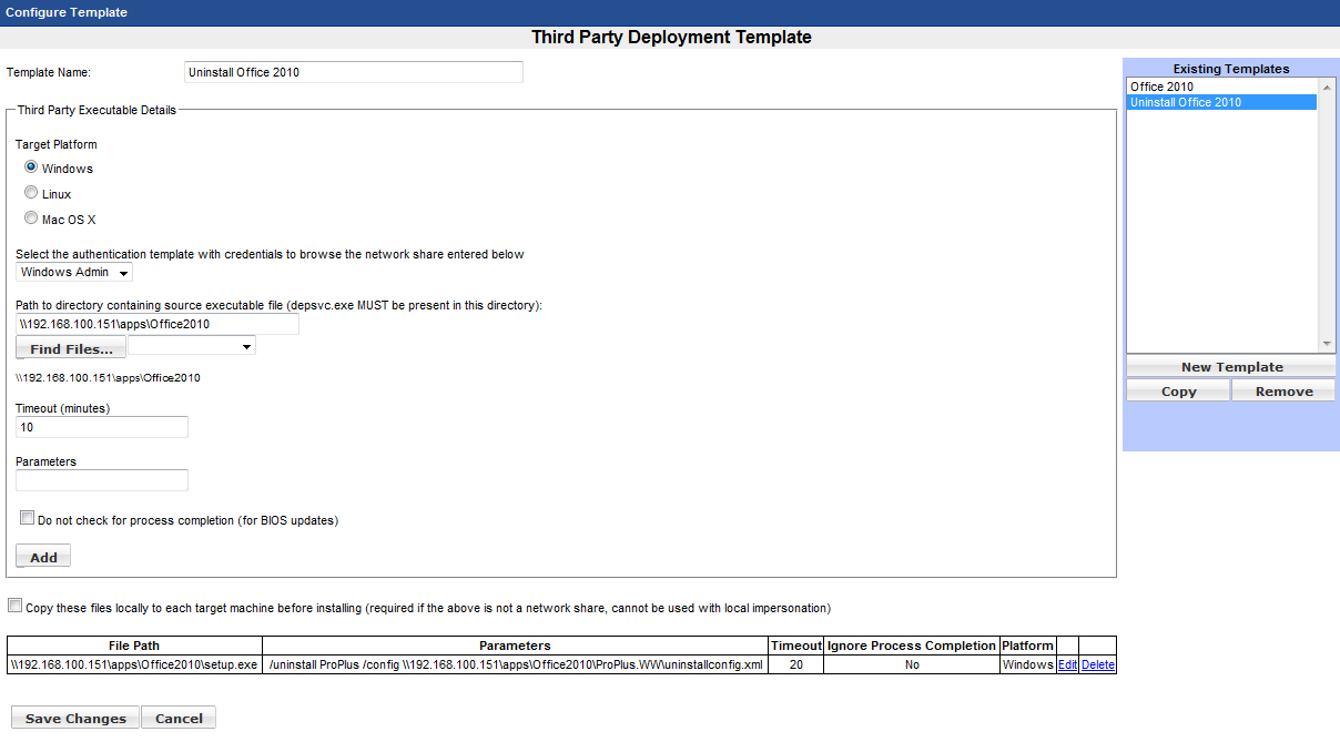 In Management Utility, create a Third Party template. Enter a template name. Choose Windows as the target platform and select the correct authentication template. Enter the path to the network share; this path will already be present if the default path has been entered in Administration Settings. Click the Find Files button and navigate to the subfolder containing the Office 2010 installation files. Use the drop down menu to select setup.exe.