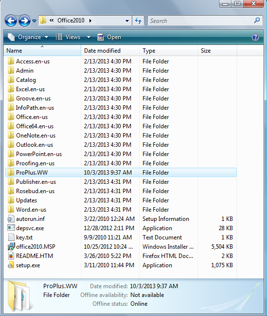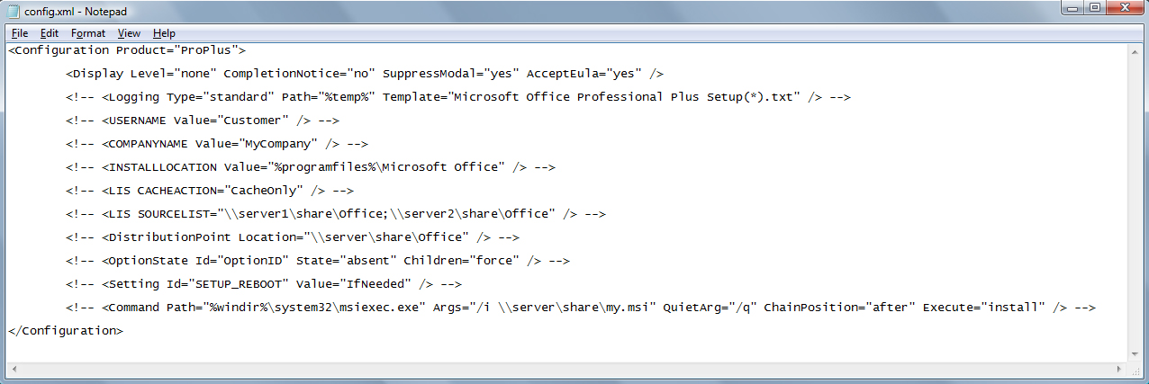 The core product folder for an Office installation is the folder named for the core product with “.WW” appended. In our example the installation is for Office 2010 Professional Plus, and the folder ProPlus.WW is the core product folder. Navigate into this folder and use a text editor such as Notepad to open config.xml.
