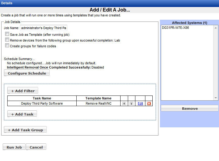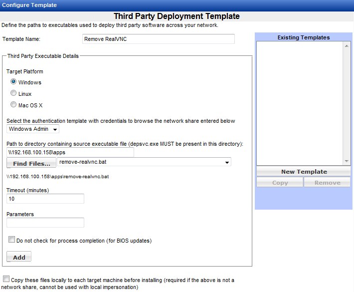 In this example, we have created a template to uninstall RealVNC. A template for uninstalling UltraVNC would be created in the same way. A single template to run both scripts can also be made, by adding first one batch file and then the other.