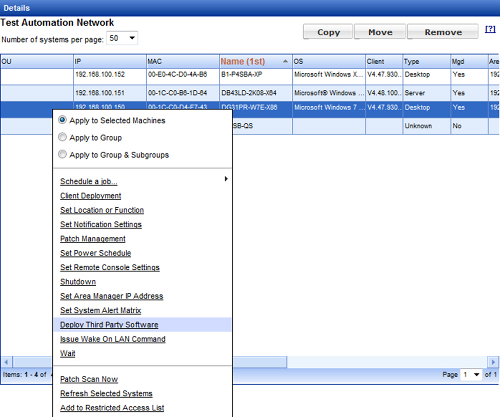 Now you can test deployment to a single system. Select a system in the Groups area. Click the system row, then right-click to display the context menu. From the menu, choose Deploy Third Party Software.