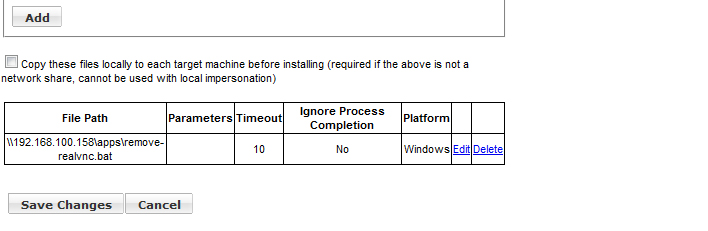 Please note that the IF EXIST statements are single lines, each one ending with the /NORESTART parameter. Save the batch file (in our example we will use the name remove-realvnc.bat) and copy it to the network directory defined as the Default Application Path in the Administration Settings area of the Management Utility.
