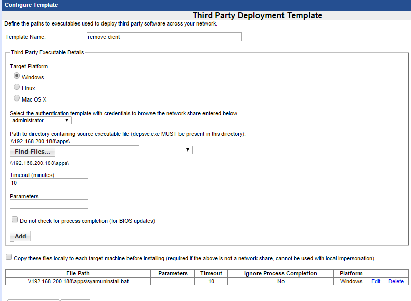 Now Create a Third Party Deployment template to run the batch file for removing the SyAM Client