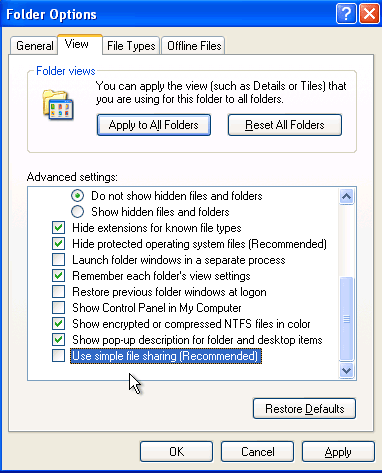 The Simple File Sharing feature of Windows XP is not supported by Management Utilities, and must be disabled on all XP systems. To disable this feature, choose My Computer from the Start menu or the Windows XP desktop. Go to Tools - Folder Options. Click the View tab and find "Use Simple File Sharing (Recommended)" in the list of advanced settings. It should be at or near the bottom of the list. If the feature is enabled, click to clear the checkbox. Click OK to close the Folder Options dialog.