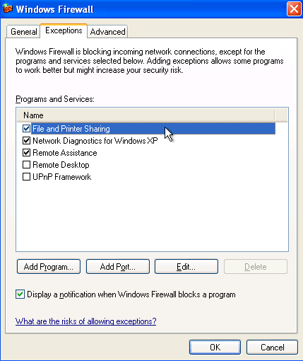To configure the Windows firewall, choose Control Panel from the Start menu. In Control Panel, go to Windows Firewall. The Windows Firewall dialog will be displayed. If the firewall is enabled, you will need to add exceptions. Click the Exceptions tab. Check the box for File and Printer Sharing. Click OK to close the Windows Firewall dialog.